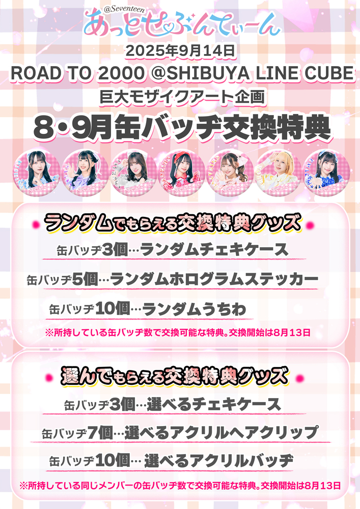 7月度の缶バッヂ特典の交換について INFORMATION あっとせぶんてぃーんワンマンライブ Road To 2000 Tokyo Fight 1/1 Bounce Back!!特設サイト 2025/06/30 12:00 フォロー いつもお世話になっております。 7月度の缶バッヂについては、以下のご案内およびデザインになります。 <7月度缶バッヂデザイン> 序機デザインのバッヂは、7月1日のリリイベから配布を開始いたします。 <7月度缶バッヂ特典> なお、7月度のバッヂ交換特典は、 7月10日のワンマン から交換開始いたします。 URLをコピーする 報告する